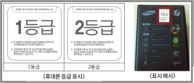 휴대폰의 경우 해당 제품의 전자파흡수율 값이 인체보호기준값(1.6W/kg)의 50% 이하일 경우 1등급을 부여하고, 기준값의 50~100%인 경우 2등급으로 부여합니다.