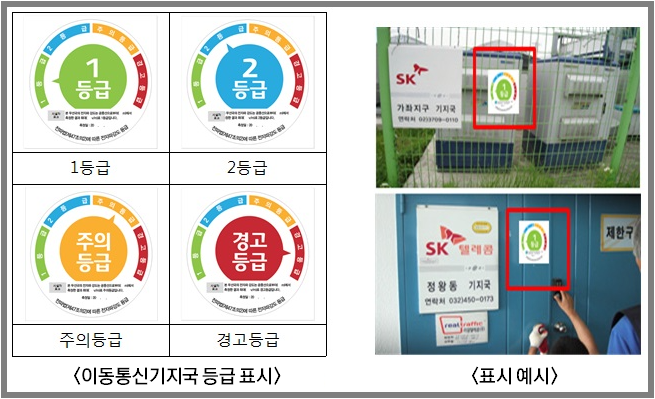 이동통신 기지국의 경우에도 눈에 띄는 위치에 전자파 방출세기를 기준으로 하는 4단계 등급을 표시해야 합니다. (4단계는 1, 2, 주의, 경고로 됩니다)