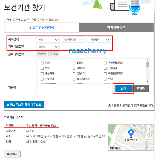 의료기관선택에 보건소를 선택해보았습니다. 그리고 검색 버튼을 클릭하면, 바로 아래 보건소 주소 리스트가 나옵니다.