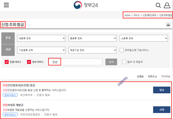 접속 및 회원가입 -> 서비스 -> 신청/조회/발급 -> 건강진단결과서(보건증)발급(인증서 필요) -> 발급