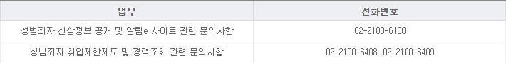 여성가족부 전화 문의 ☏ 02-2100-6100 (성범죄자 알림이 홈페이지 문의번호와 동일함)