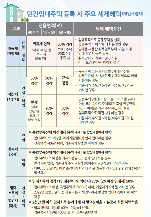 3) 세제혜택은 주행유형, 기준시가, 면적, 등록시기, 임대의무기간 등에 따라 상이하므로 등록 전 국세청(세무서) 또는 시, 군,구 세무과에 확인하시기 바랍니다.