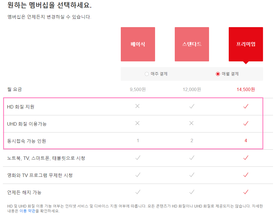 넷플릭스의 요금은 스마트폰, 태블릿, 스마트 TV, 노트북, 스트리밍할 수 있는 디바이스 등 다양한 기기에서 한가지의 월정액 요금제로 시청할 수 있는 점이 장점인데요~
