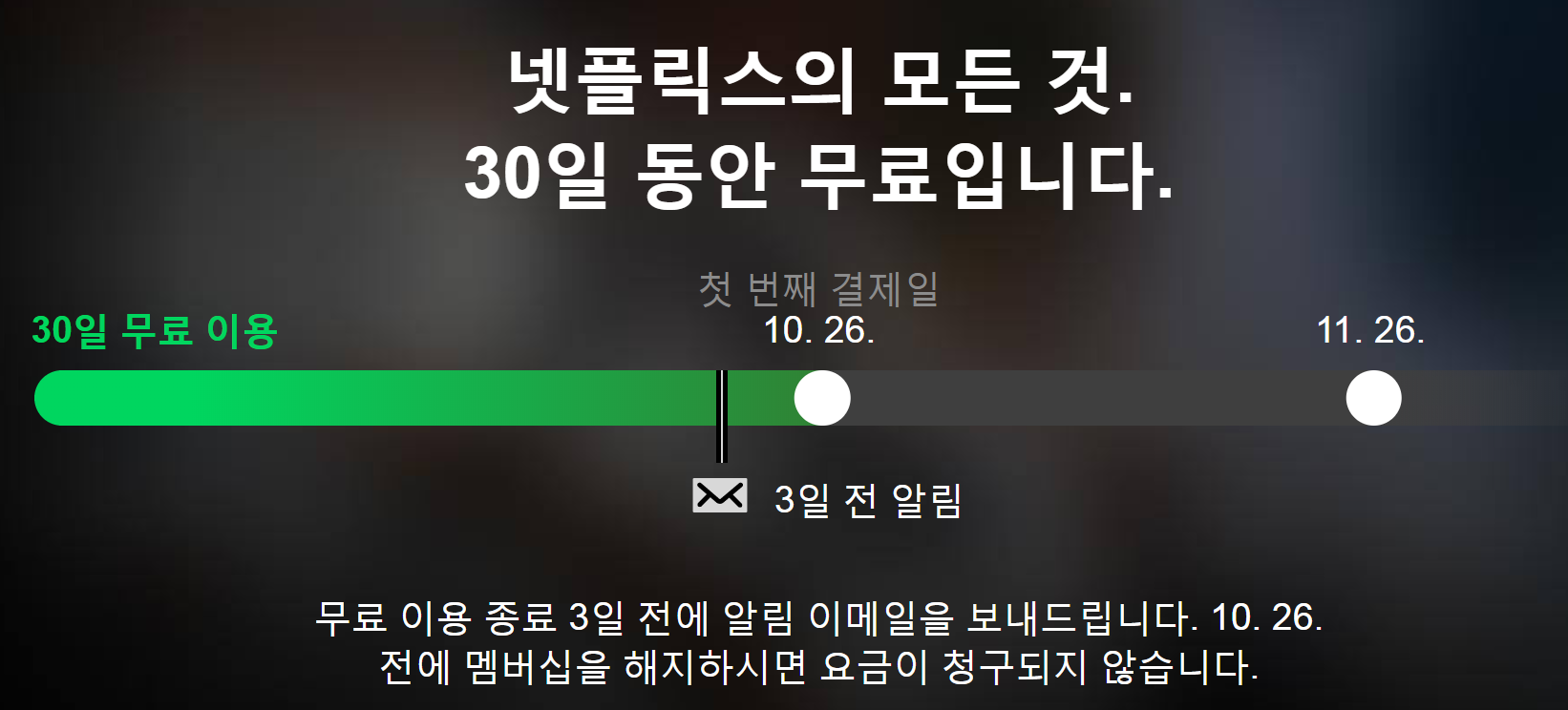 넷플릭스는 요즘 구독서비스라면 다들 써먹는 1달 무료 서비스를 제공하고 있습니다. 넷플릭스를 일단 카드를 등록해. 무료로 사용해보고 30일 이후에는 알아서 구독을 해지하렴~ 하는 방식인데요. 한달 구독료는 무료이긴 하지만, 최초 구독시 등록한 카드에서 자동결제가 되는 시스템입니다.