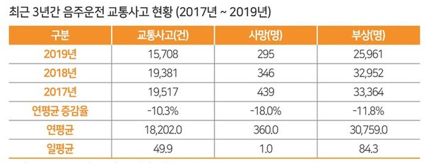 음주운전 교통사고가 하루 평균 50건이 발생하고 있으며, 교통사고 사망자가 매일 나오고 있습니다.