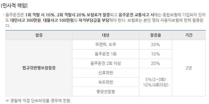 음주운전으로 적발된 운전자는 보험료 인상과 자기부담금에 해당하는 민사적 책임,