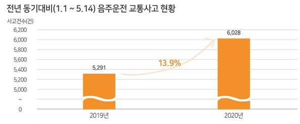 전년 동기대비 음주운전 교통사고 현황을 보면 감소하는 추세가 아니라 13.9%나 증가하였습니다.