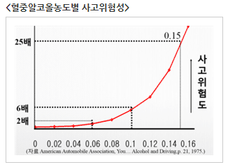 모두가 알고 있는 사실, 음주운전을 하면 행동능력이 떨어지고 혈중 알코올 농도가 증가할수록 신체능력 및 판단능력이 떨어져 교통사고가 일어날 확률이 높아집니다.