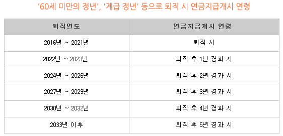 · 2016년~2021년까지는 60세 또는 정년퇴직한 달의 다음달부터 입니다.