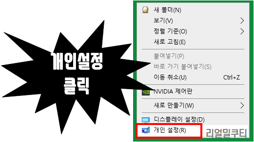 바탕화면에 오른쪽 클릭을 해주세요. 그럼 다음과 같은 창이 뜰거예요. ↓↓↓
