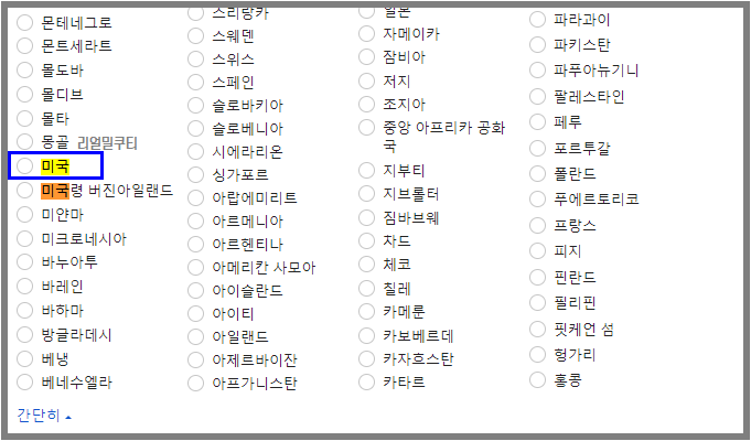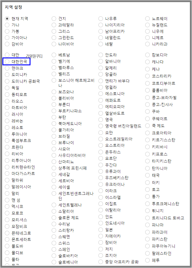 지금은 '현재지역'으로 되어 있는데, 미국으로 설정을 변경해봅시다. 그리고 아래 확인을 누릅니다.