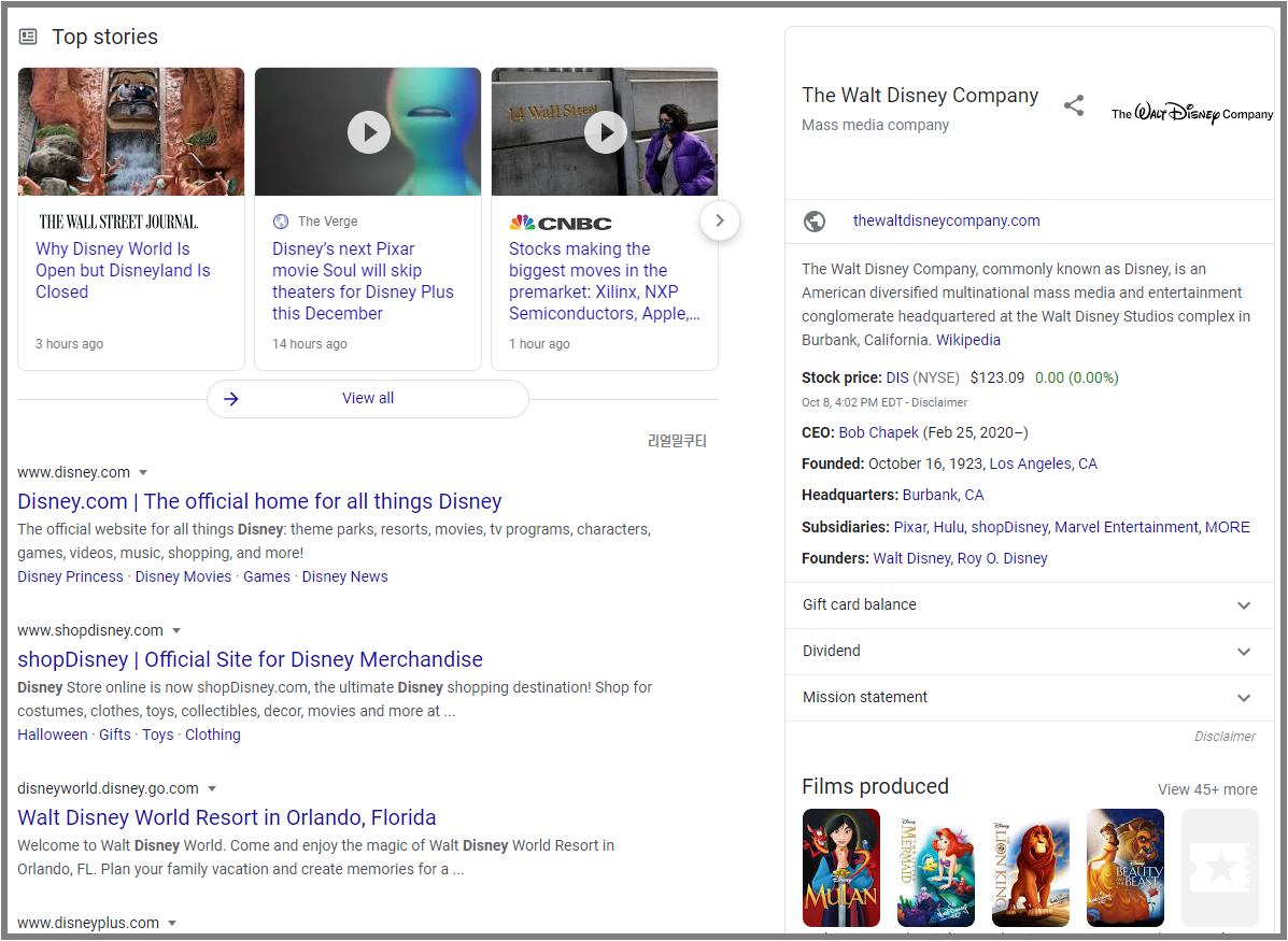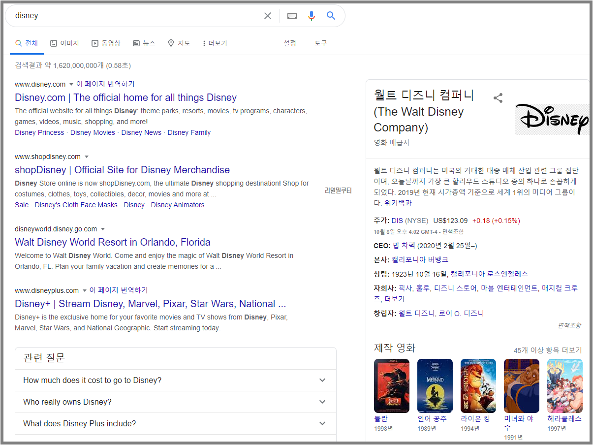 검색어는 disney로 해봤습니다. 검색 결과 화면이 동영상, 질문 등 사이트 결과 순서가 약간씩 다른 경향을 보이고 있습니다.