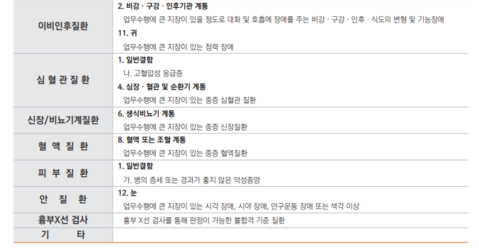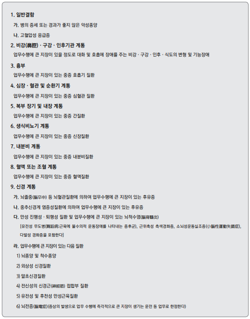아래부터는 대부분 업무수행에 큰 지장이 있는 질환에 속할 경우를 판정 기준으로 봅니다.