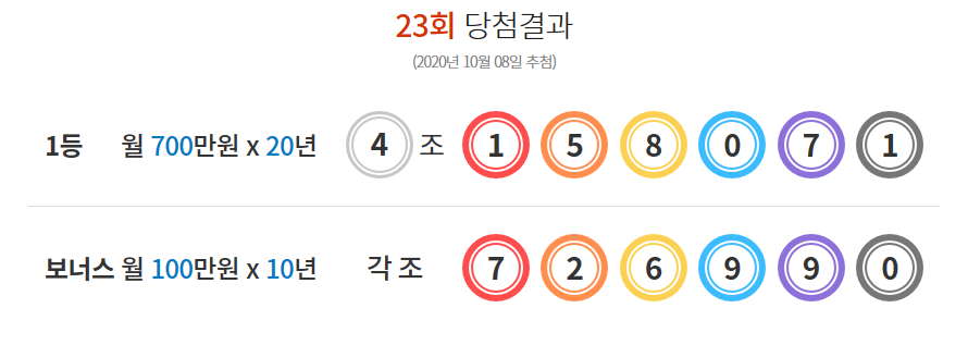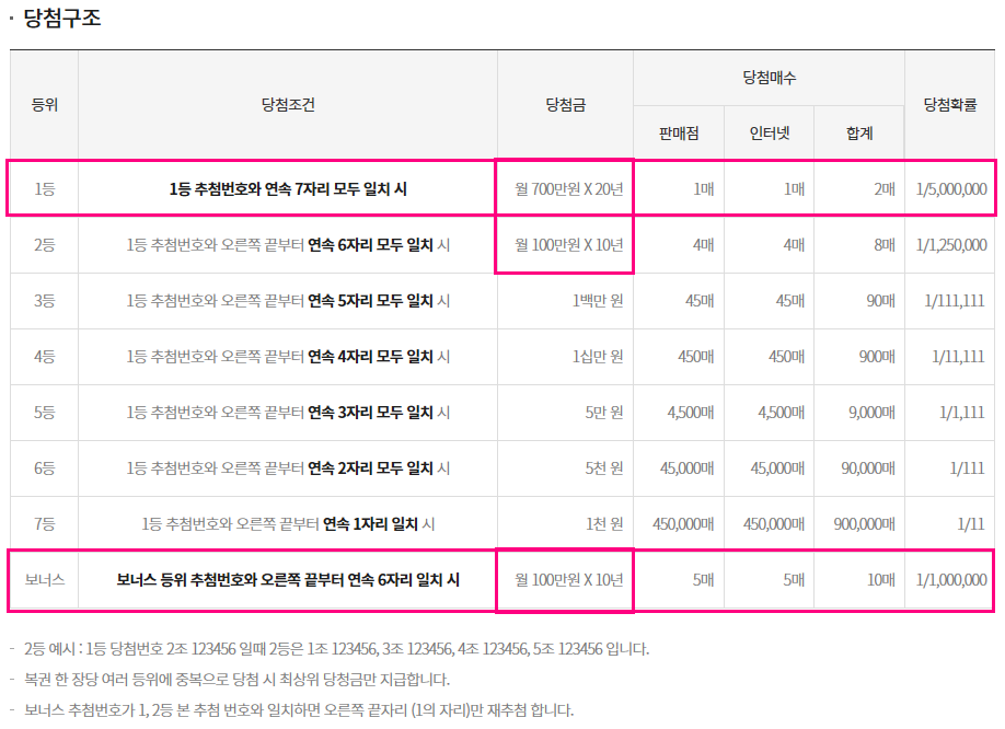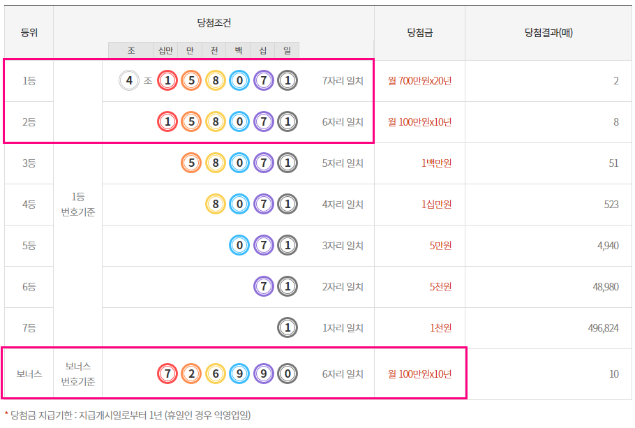 1등의 경우 추첨번호(조)와 숫자 7자리가 연속으로 모두 일치해야 합니다.