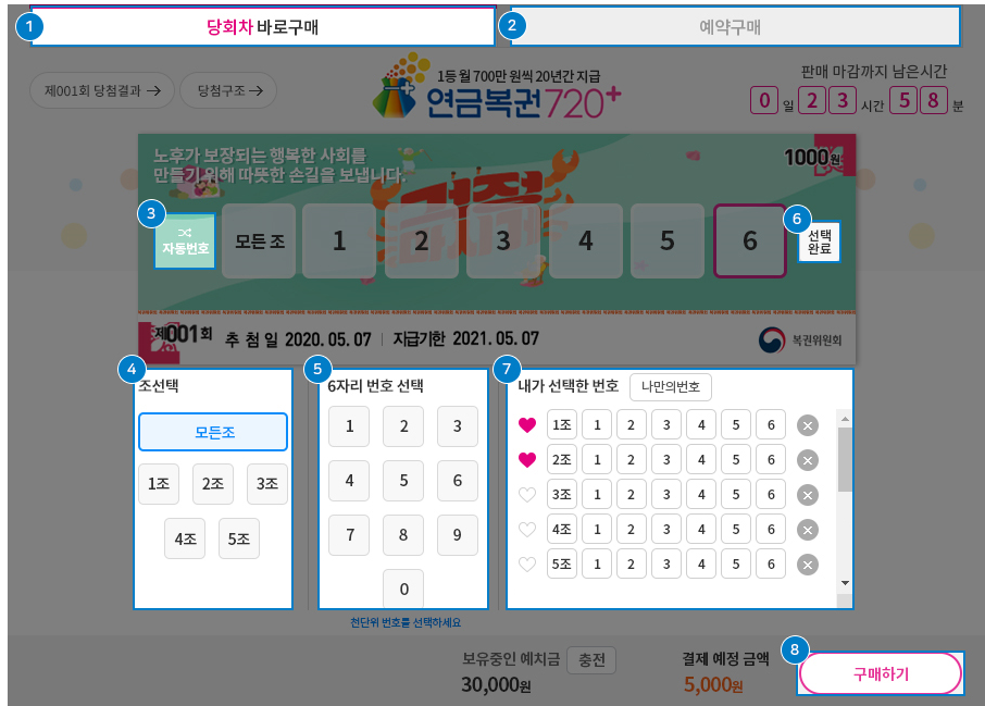연금복권은 1조~5조 + 총 6자리입니다. 총 100만개*5조 = 500만개의 번호가 존재합니다.