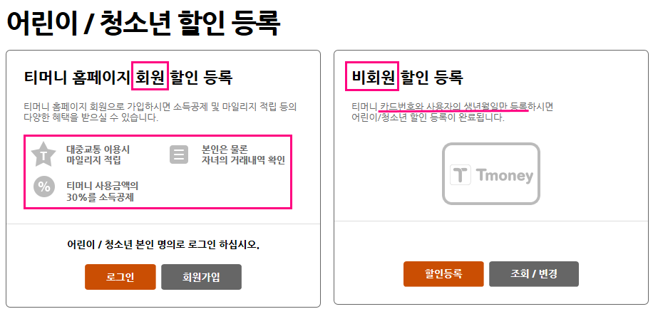 아래 티머니(Tmoney) 홈페이지에서 어린이 및 청소년 할인 등록을 하실 수 있습니다.