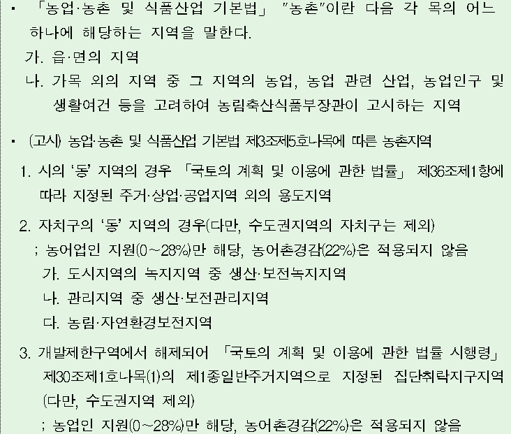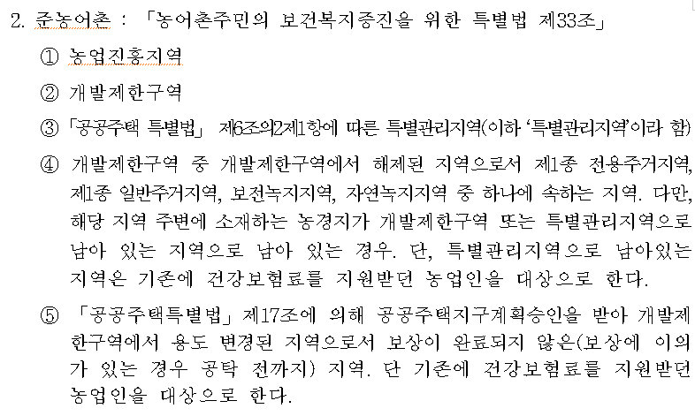 ※ 고시 2, 3번의 경우 농어업인 지원만 해당하며, 농어촌경감은 적용되지 않음. 2, 3번에 해당하는 지역이 준농어촌에 해당할 경우도 있을 수 있으므로 지자체 및 국민건강보험공단(이하 ‘공단’이라 한다.) 담당자는 지역요건 확인 시 주의