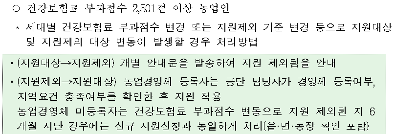 - 농어촌 및 준농어촌지역에 거주하면서 지역건강보험에 가입한 세대이며, 농업, 축산 및 임업에 종사하는 경우 지원 대상이 됩니다.
