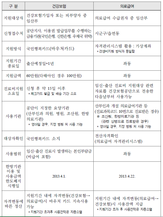 건강보험과 의료급여 임신, 출산 진료비 지원방식 비교