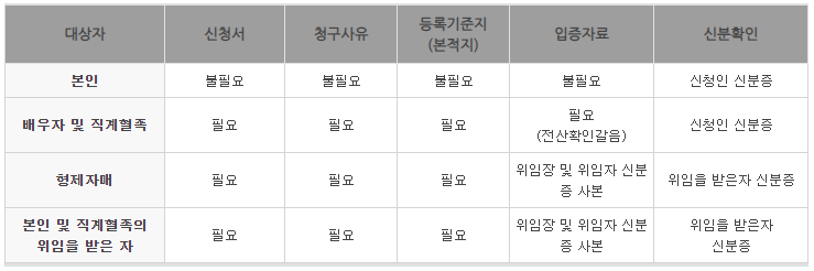 - 배우자나, 직계혈족이 가실 경우 등록부 등의 기록사항등에 관한 증명신청서, 방문자 신분증이 필요합니다.