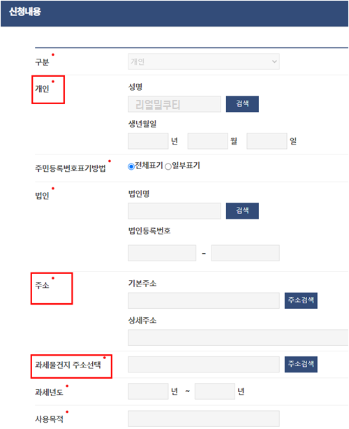 “과세물건지 주소선택” 입력칸에는 자동차 등록소재지를 작성해주세요.