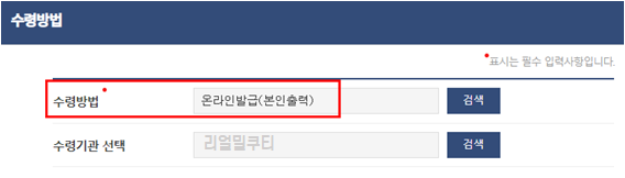 수령방법은 온라인발급을 해주시고 방문 수령하고 싶으시면 수령기관까지 선택해주시면 되겠습니다.