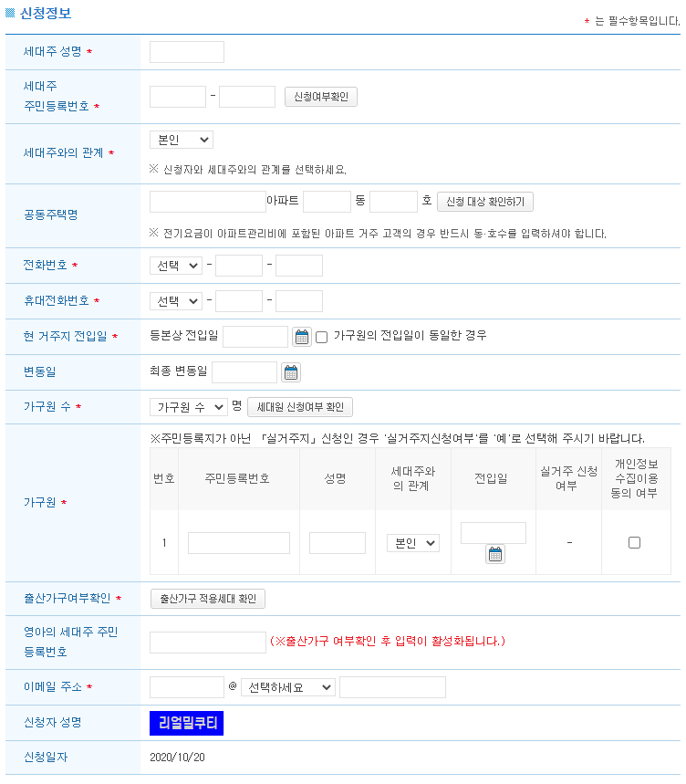 - 재외동포 및 외국인 가구는 국내거소 신고증, 외국인 등록증 등으로 주민등록표를 대신할 수 있습니다.
