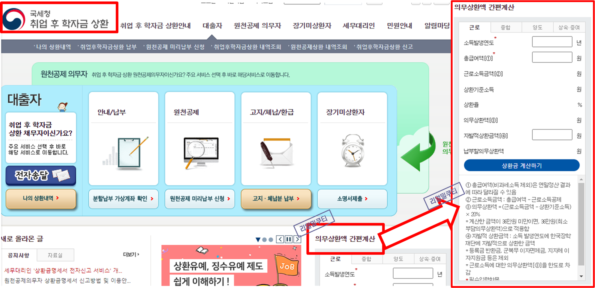 국세청 취업 후 학자금상환 홈페이지(http://www.icl.go.kr/rsa/)로 접속하면 의무상환액을 계산할 수 있습니다.