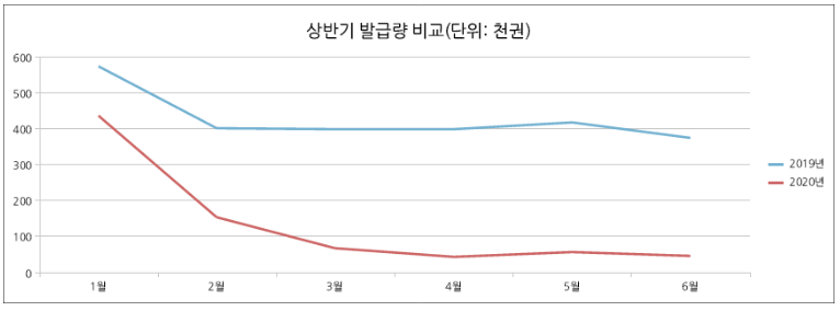 ·월평균 발급량은 2019년 400,000권 -> 2020년 50,000권 이었습니다.
