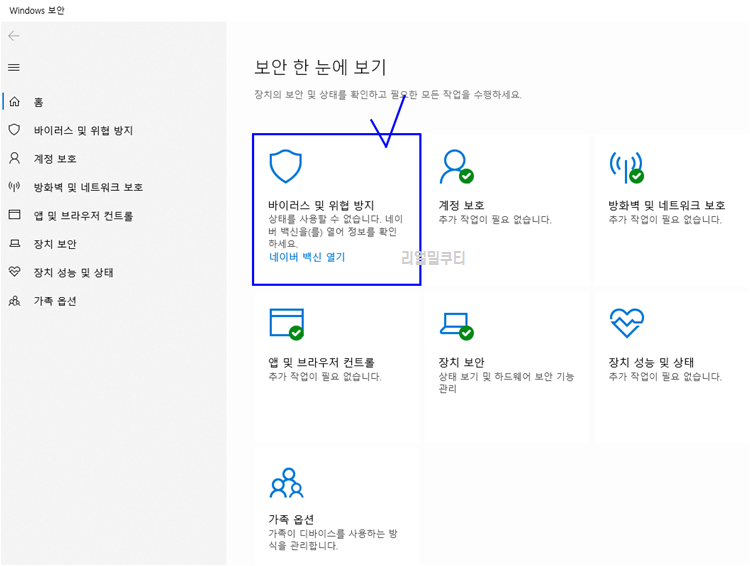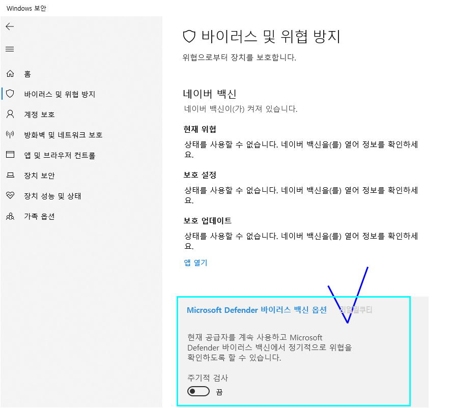 저의 경우 왜때문인지 모르겠지만 네이버 백신이 설치되어 알아서 디펜더를 끄고 있습니다.