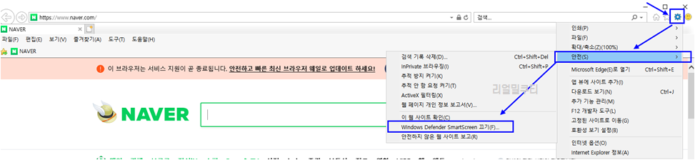 익스플로러에서 오른쪽 상단에 보시면 톱니바퀴 [설정]버튼이 있습니다. 이걸 눌러주고 [안전]을 클릭해주세요.
