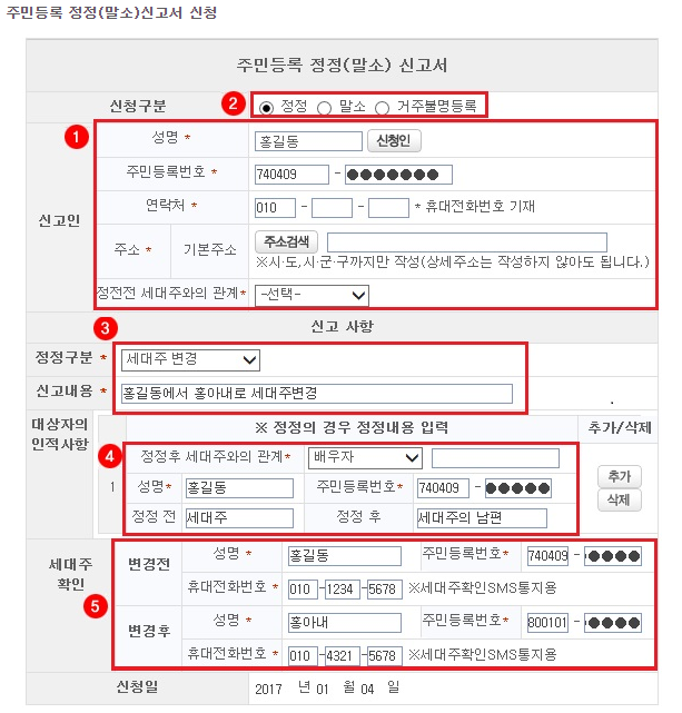 세대구성, 세대편입으로 전입신고를 하신 후, 주민등록 정정(말소) 신고를 하여 세대주를 변경합니다.