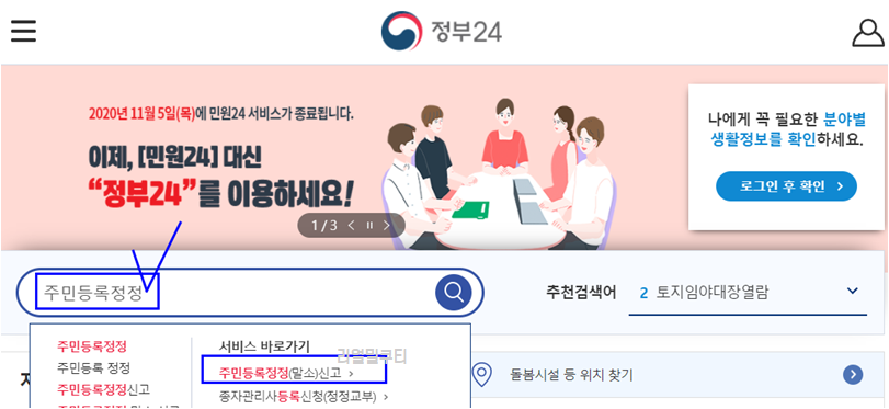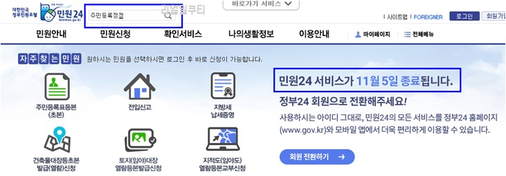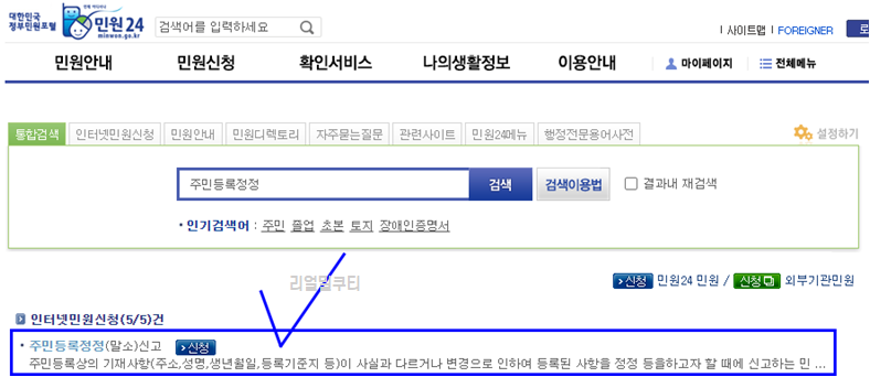 검색창에 주민등록정정을 입력해주세요.