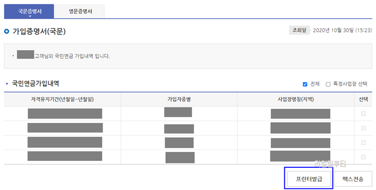5. 국민연금 가입증명서를 국문 또는 영문 선택 후 출력하실 수 있습니다.