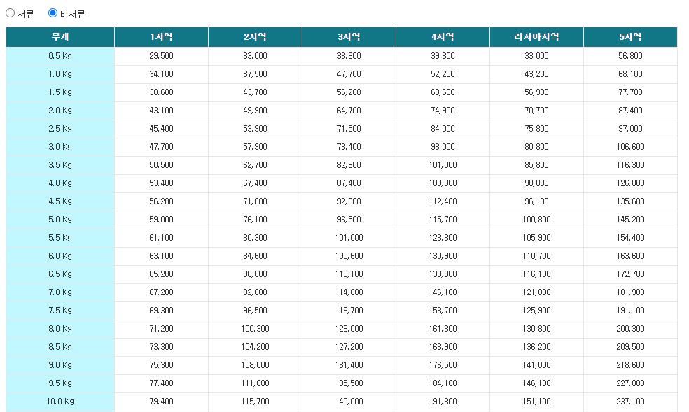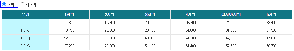 ■ EMS 프리미엄 가격 : 서류 무게 0.5kg ~ 2.0kg