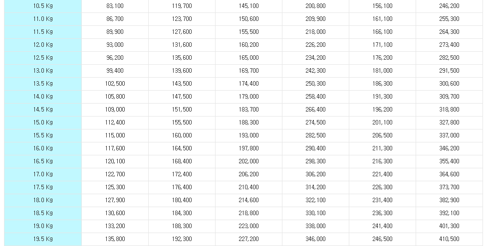 ■ EMS 프리미엄 가격 : 비서류 무게 10.5kg ~ 19.5kg