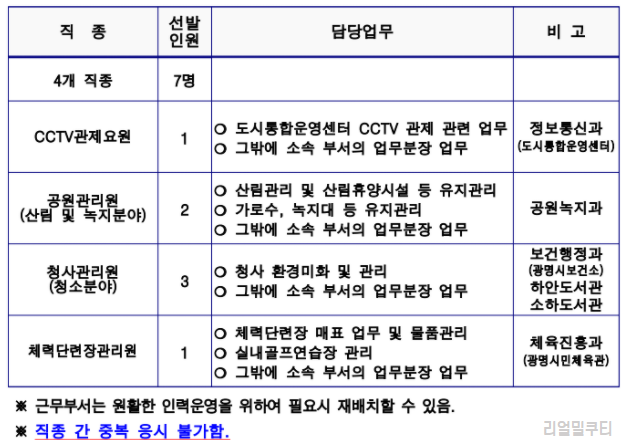 CCTV 관제요원(도시통합운영센터) 1명, 공원관리원 2명, 청사관리원(광명시보건소, 하안도서관, 소하도서관) 3명, 체력단장관리원(광명시민체육관) 1명으로 총 7명을 선발 예정입니다.