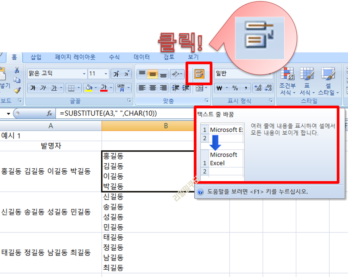 그리고 함수 입력한 셀은 아래와 같이 모두 “텍스트 줄 바꿈”이 처리 해주세요.