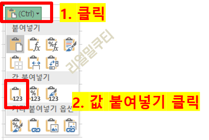 붙여넣기 할 때, “값으로 붙여넣기” 즉, “값”만 선택하여 붙여넣습니다.