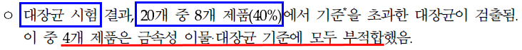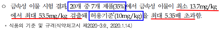 – 기준 초과 제품 20개 중 8개, 이 중 4개 제품은 금속성 조사결과에서도 허용기준을 초과한 것이었음