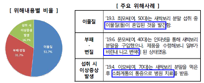 아마도 이물질이나 부패 및 변질된 새싹보리분말 제품이 원인이겠지요.