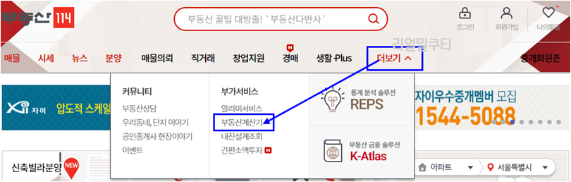 부가서비스 항목 밑에 부동산계산기가 있습니다.