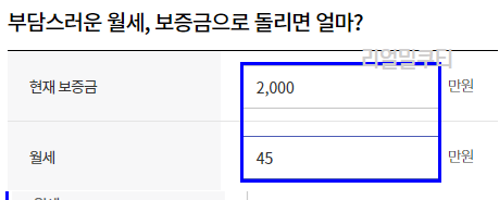 저는 현재보증금 2천만원 넣어주고, 월세 45만원 넣어줬습니다.