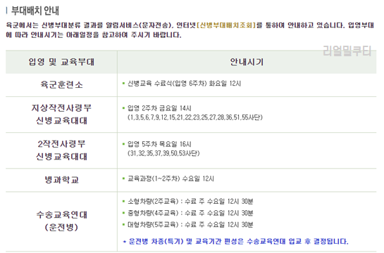 - 입영 및 교육 부대 안내시기