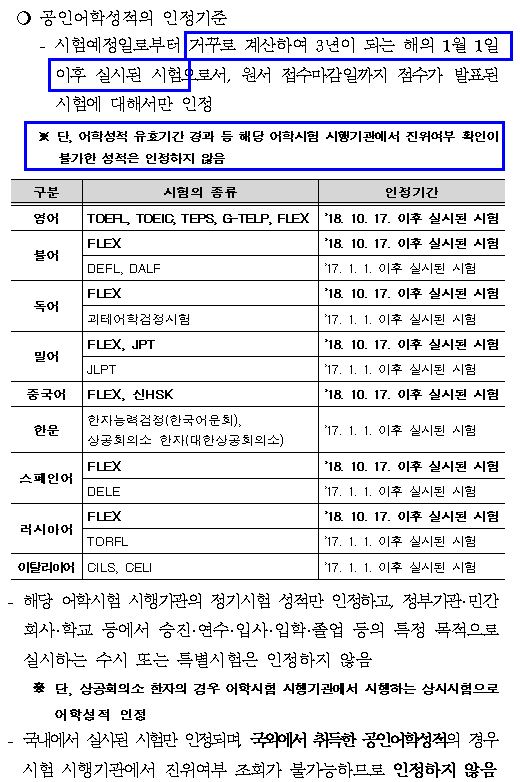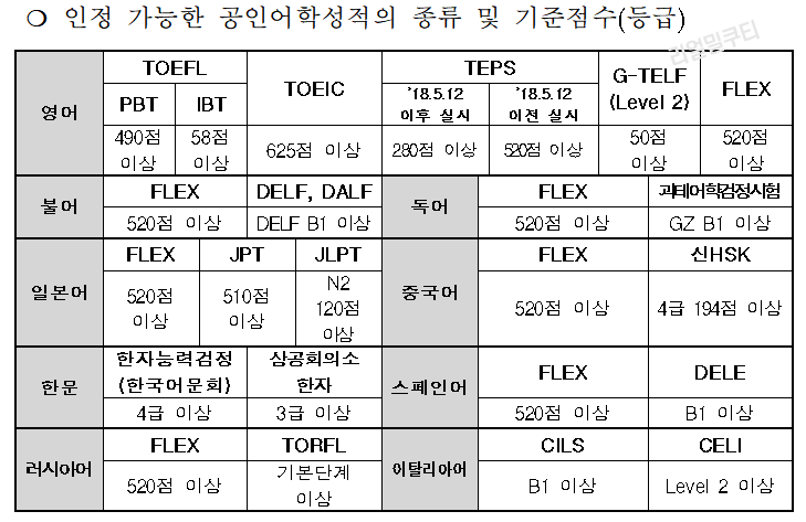 ○ 인정 가능한 공인어학성적의 종류 및 기준점수