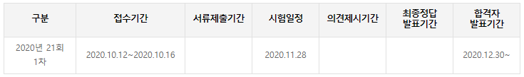2020년 제21회차 시험일정은 11월 28일 입니다.