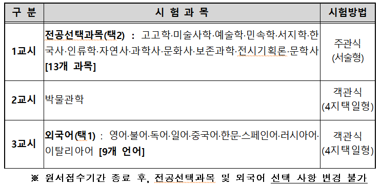 - 13개 과목: 한국사, 과학사, 문화사, 보존과학, 전시기획론, 문학사, 고고학, 미술사학, 예술학, 민속학, 서지학, 인류학, 자연사