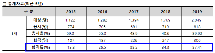 위 통계자료를 보시면 최근 3년간인 2017년~2019년은 대체로 35% 정도의 합격률을 보이고 있습니다.