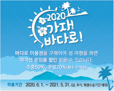 제주도, 울릉도, 인천, 여수, 통영, 거제, 군산, 목포, 완도, 충남 지역권에 있는 섬을 무제한으로 20%~50% 할인 받아 이용할 수 있는 여객선 이용권을 바다로-연간이용권, 바다로-가족권이라고 합니다. 😆😆 섬여행을 위해 섬으로 들어갈 때는 모두 배를 통해서만 진입할 수 있습니다. 포항에서 울릉도 들어갈 때도 7만원에 육박하는데, 그것도 편도로요!! 이번년도, 그리고 내년 2021년 5월 31일까지 섬으로의 여행을 계획하고 계시거나 가고 싶다면~ 연간 횟수 무제한 운임할인권을 이용하여 보는 것 어떨까요? 😉😉