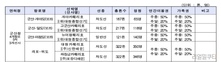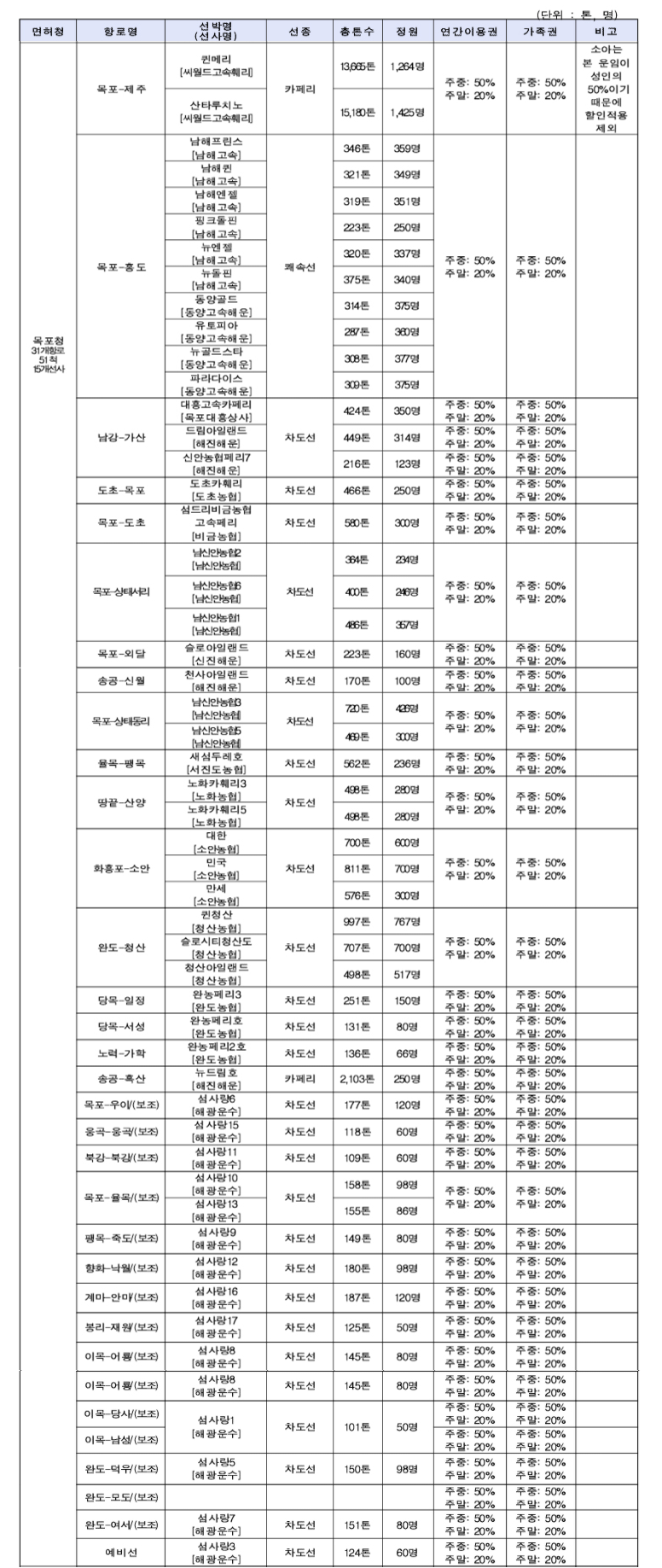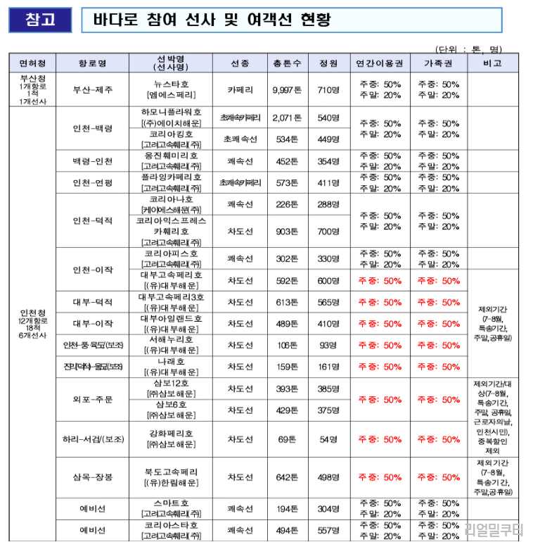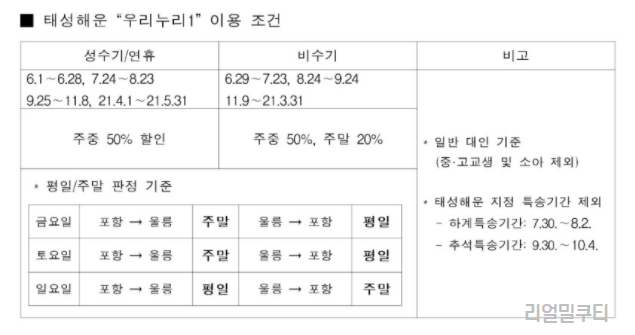 ◇태성해운 우리누리1호 이용 조건(평일 주말 할인률)